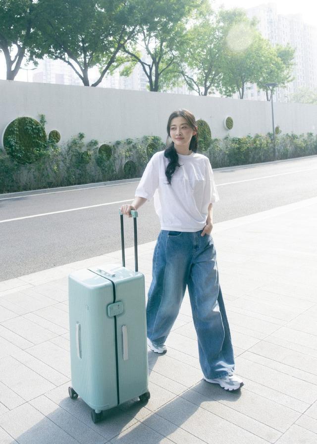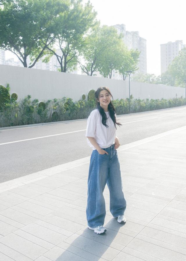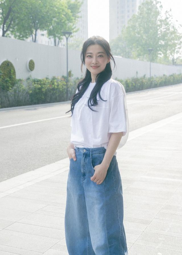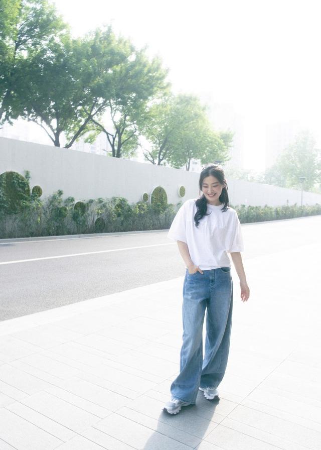 穿搭部分,梅婷用基础白t+牛仔阔腿裤的组合,把 “松弛感” 做到了极致。上身选择的是一件落肩款宽松白T恤,纯棉面料柔软亲肤,版型宽松却不臃肿,恰到好处地遮住了腰腹及手臂的小赘肉,对身材的包容度极高。白色作为基础色,干净透亮,不仅衬得肤色更加白皙,更自带一种简约大方的真实高级感。